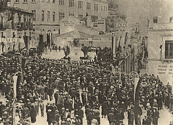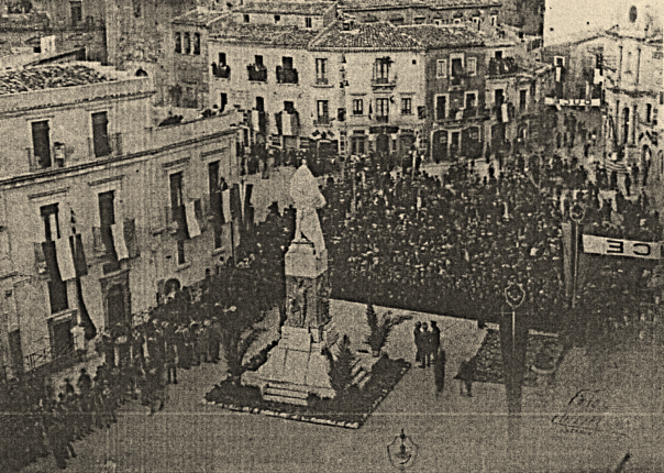 Il monumento a Luigi Capuana viene inaugurato il 9 ottobre 1939. Fino ai primi anni ’30 a Mineo e di fronte il palazzo Tamburino in via Umberto ex Via del Mercato, esisteva un bel palazzo, però malandato. Apparteneva alla famiglia Mazzone e nella parte ad est, il prospetto, dava sulla piazza. Era molto elegante, di stampo barocco, e al piano terra vi erano delle botteghe, così composte: la prima a sinistra era una società di operai, e siccome tra loro vi erano anche degli artigiani che realizzavano tridenti di legno, aveva preso il nome di “Società del Tridente”. La seconda era una rivendita di tabacchi, n. 1 – la prima che si è aperta a Mineo – e apparteneva al sig. Armeni, detto a Saccàra ed era il padre della signora Enza che fino a pochi anni fa aveva il tabacchino oggi gestito dal sig. Tenerezza. Il sig. Armeni in seguito veniva anche chiamato l’acqualuoru, perché fu il primo fontaniere del Comune di Mineo. Nella terza bottega operava un bastaio o vardunaru, apparteneva al padre di Don Pinuzzu Amato, detto Liesina (dal nome dello strumento usato per cucire il cuoio). Dopo la distruzione del palazzo, a loro fu consentito di costruire una casa fuori porta, nella quale sono stati utilizzati alcuni stipiti del vecchio edificio abbattuto. Dopo la realizzazione della piazzetta, gli Amato ebbero un locale sottostante, in via Ponte Tamburino. La quarta era una bottega che vendeva stoviglie per la casa, gestita dal sig. Varsallona detto u cartagirunisi.