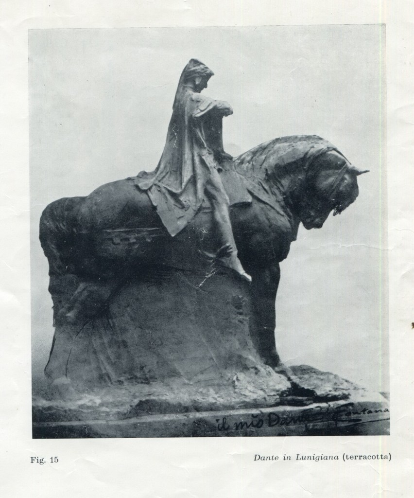 Di Dante equestre non si conosce la data di esecuzione. I riferimenti all’attività di Fontana nella scultura in terracotta svolta nei periodi in cui tornava a Sarzana e si avvaleva della collaborazione delle Fornaci Fratelli Saudino porterebbero agli anni Venti dato che la Fornace funzionò dal 1927, e anche le ipotesi e le promesse di realizzare dal bozzetto un monumento appartengono a quel decennio e oltre. Tuttavia si possono avanzare delle ragioni per una datazione intorno agli anni Dieci, in un periodo in cui si manifestava un interesse in particolare per la vicenda di Dante in Lunigiana, l’area geografica cui oltretutto Fontana apparteneva. Ricordiamo la ricca pubblicazione illustrata Dante e la Lunigiana, nel sesto centenario della venuta del poeta in Valdimagra 1306-1906, 1909 Hoepli, senza dimenticare Giovanni Papini, La leggenda di Dante, Lanciano 1911.
