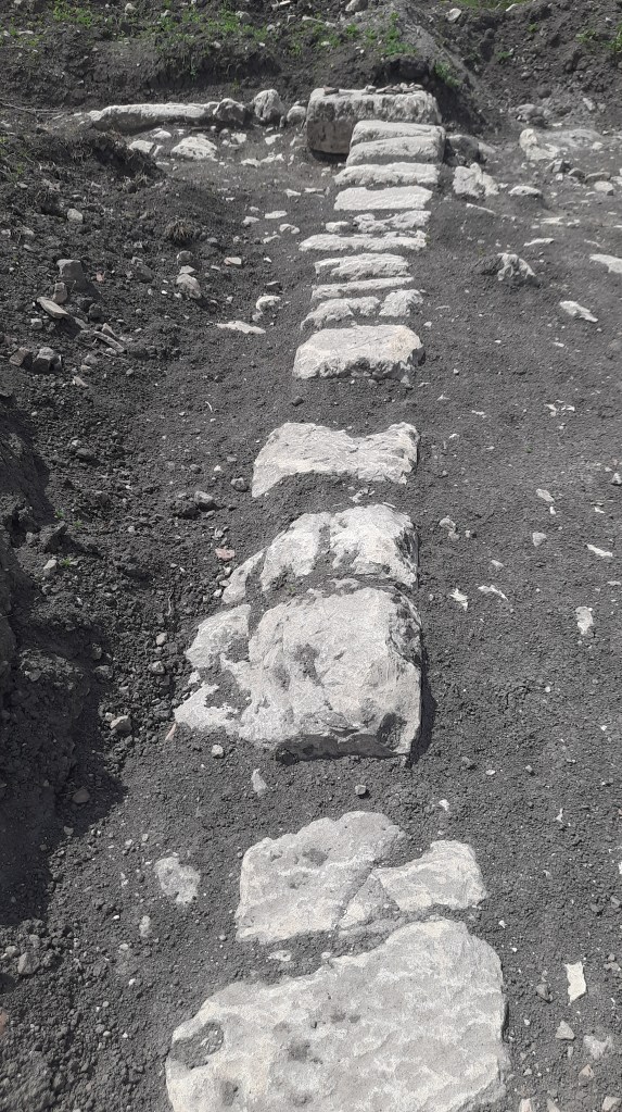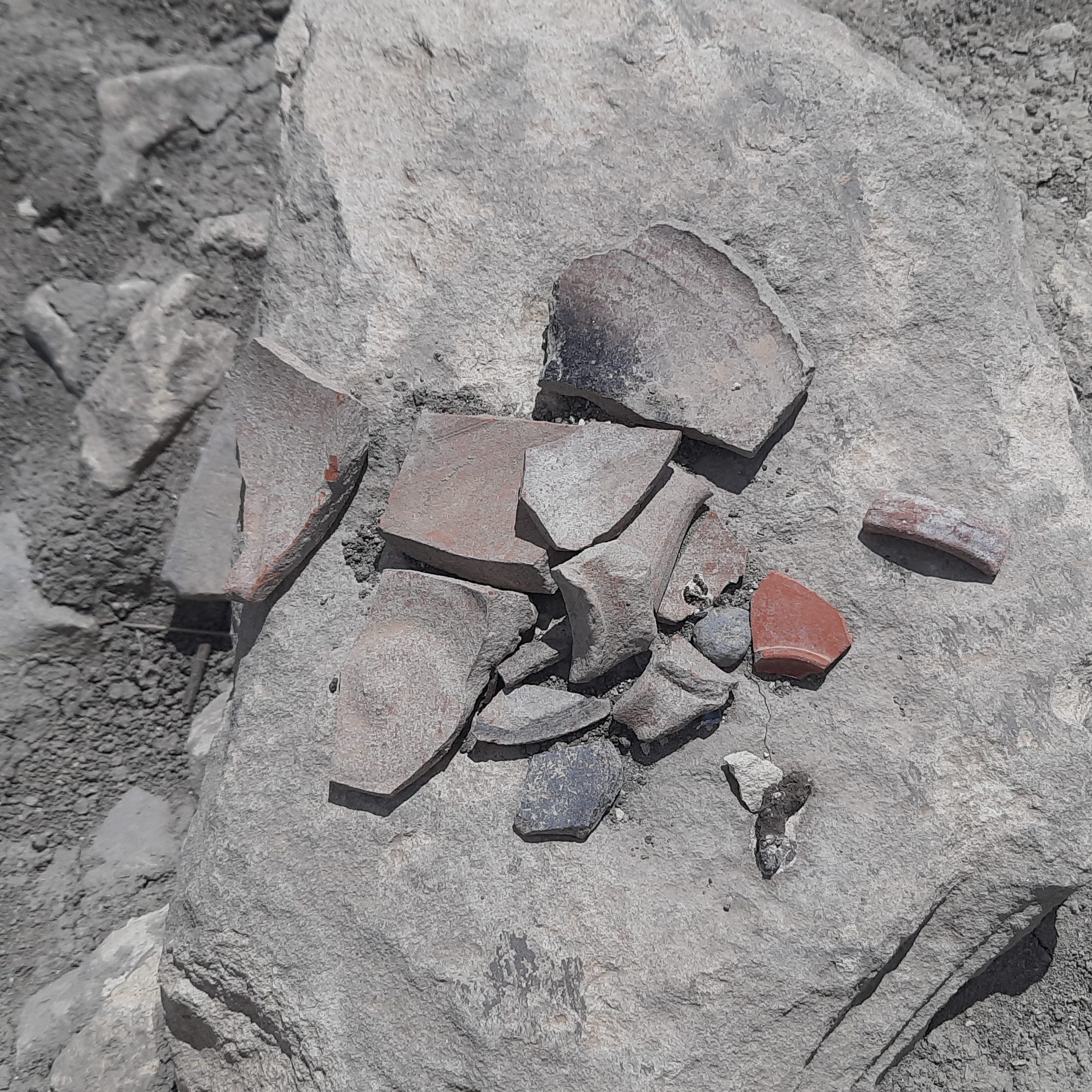 Come si può vedere dalle prime immagini, il saggio di scavo ha seguito un perimetro di forma quadrangolare, definito da strutture murarie rinvenute a ca. 1 mt. di profondità. La parte centrale di quest’area risulta ancora inesplorata.