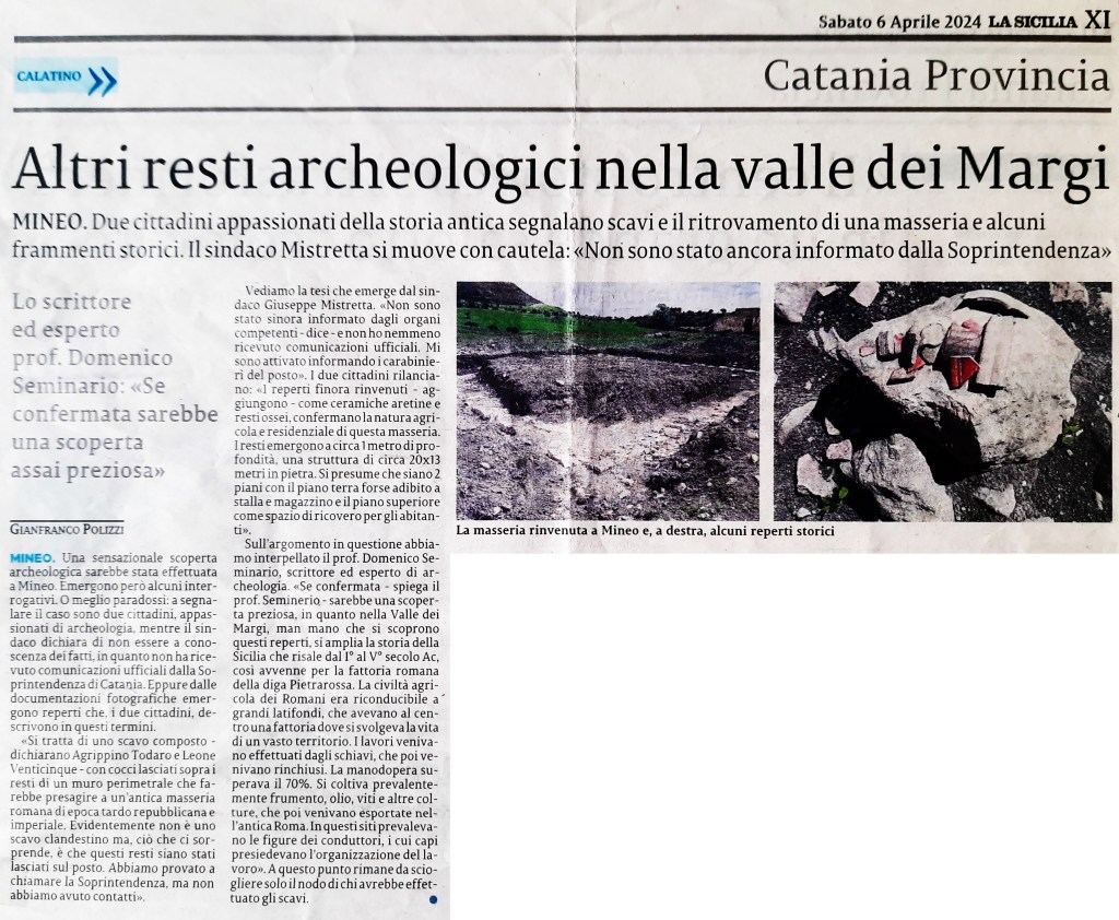 Dopo un lungo periodo di assenza, è stata avviata una nuova campagna di scavo nei dintorni di Mineo. La Soprintendenza ai beni archeologici della Provincia di Catania – o chi per lei, per alcune anomalie che si diranno più avanti – torna ad operare attivamente nei primi mesi del 2024. L’obiettivo di questo intervento sembra essere quello di verificare in loco la consistenza di segnalazioni che risalgono ormai a molti anni addietro; a quella traccia in attesa di riscontri si intende aggiungere tutte la serie di notizie che, grazie alle attuali ricerche, emergeranno dal sito. È estremamente interessante scoprire reperti archeologici che ci offrono una finestra sul passato, in questo caso, sul periodo romano in Sicilia. La scoperta di questa masseria può contribuire significativamente alla comprensione della vita e dell’economia agricola durante quel periodo storico.