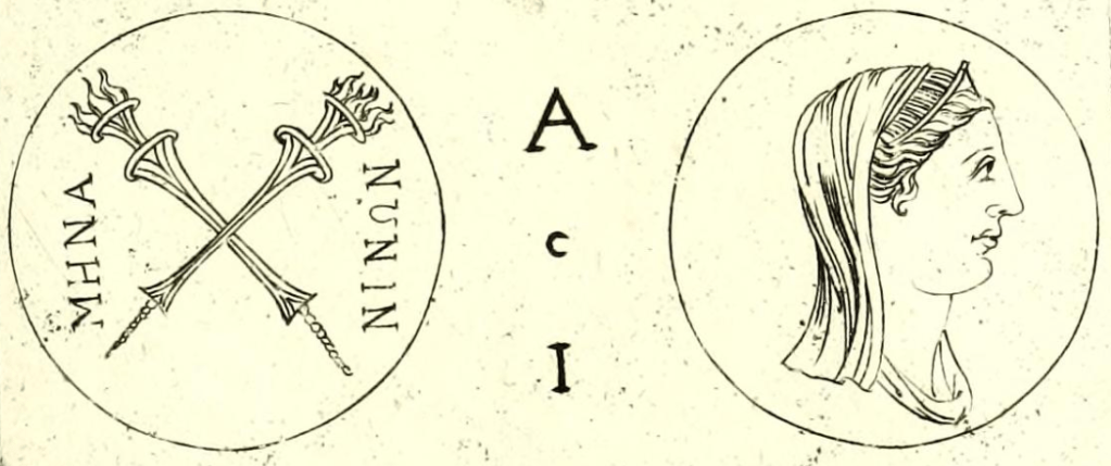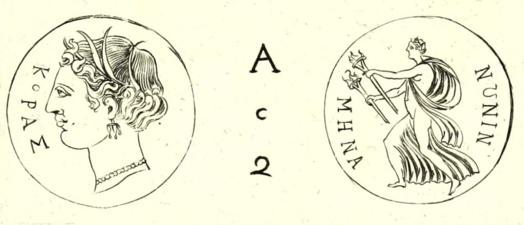 Ecco un’altro esemplare (Proveniente dall’asta Gerhard Hirsch Nach. 194, Munchen 19-21.2.1997, n. 87 (SNG Cop. n. 384)) con Demetra e i segni sotto le torce erroneamente intesi come facenti parte del nome della città [fig. 17, fonte].