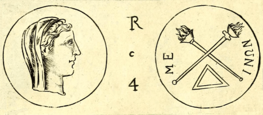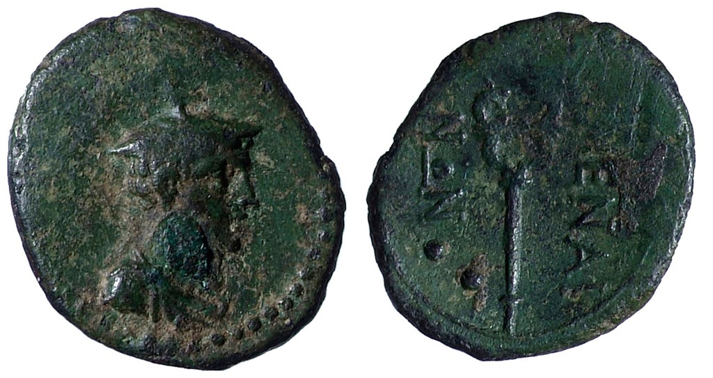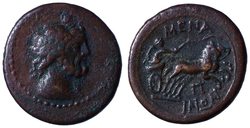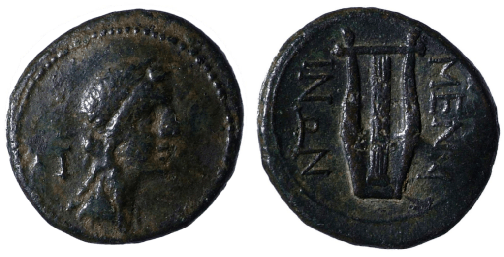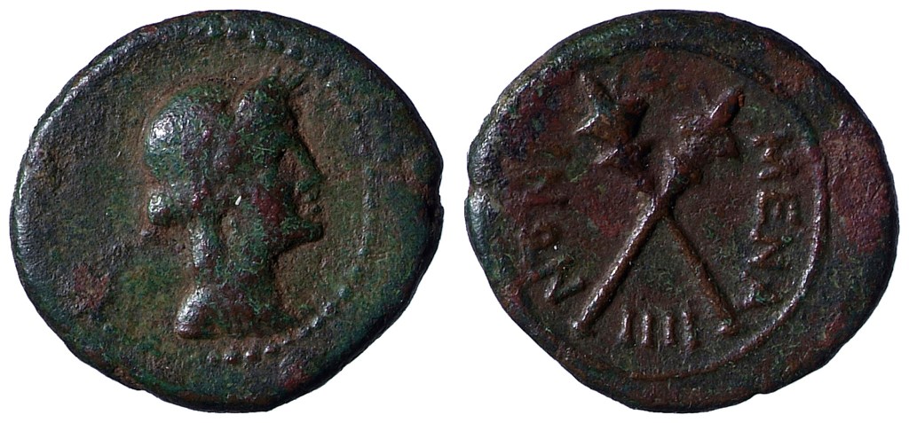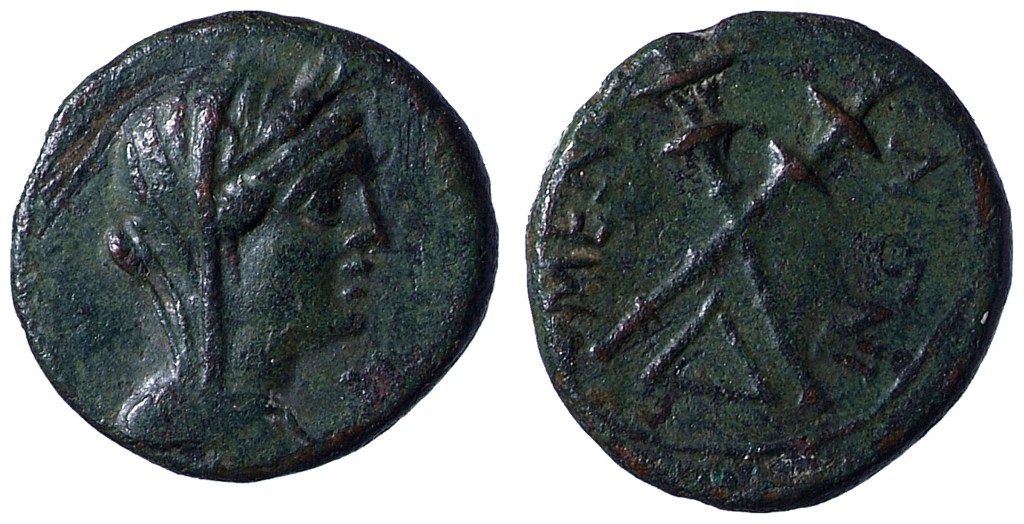 E ancora, molto simile alla fig. 3 del Peruta è quest’altra moneta [fig. 15, fonte] una Trias in rame con diametro 16 mm, datata anch’essa dopo la conquista romana e che non solo mostra la spiga di Demetra ma riporta dei segni nello spazio inferiore tra le torce (probabilmente un Δ), erroneamente identificate a suo tempo come continuazione della scritta componendo un’improbabile MENAI(NI)NΩN.