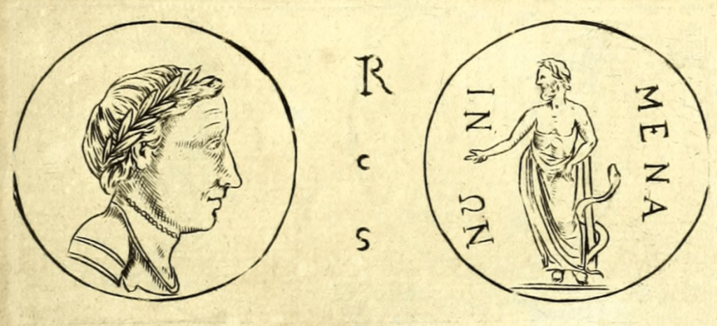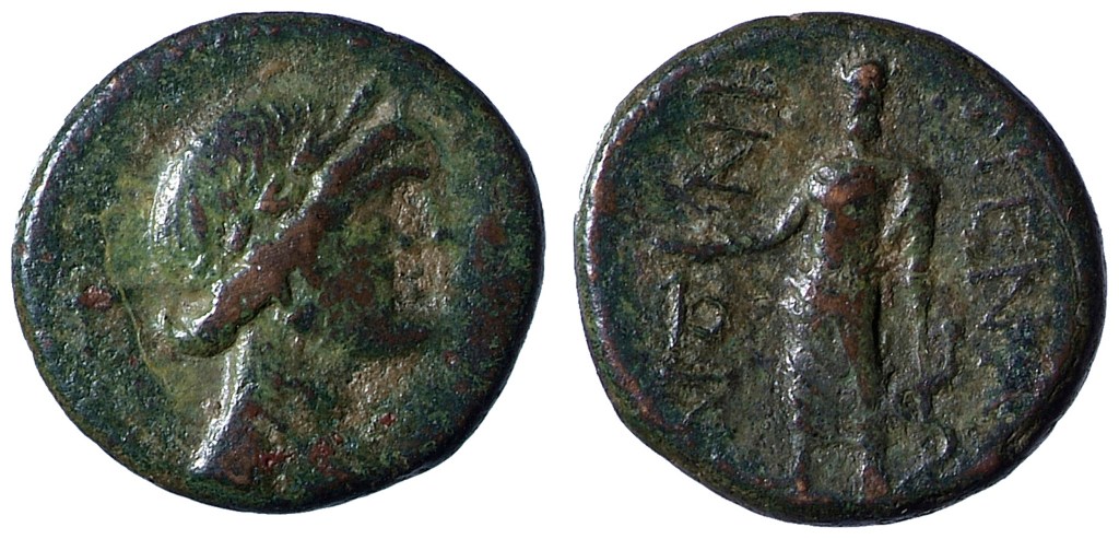 La moneta mostrata in fig. 6 mostra la testa di un personaggio illustre, con una corona o ghirlanda di alloro nei capelli, simbolo di vittoria, onore e distinzione nel mondo antico. Sulla sua identità si avanza l’ipotesi che fosse il dio Apollo. Sul verso della moneta si vede una figura maschile in piedi, seminuda con un drappo che copre la parte inferiore del corpo. Accanto alla figura si può vedere un bastone con un serpente attorcigliato, che è il simbolo distintivo di Asclepio (Esculapio), dio della medicina e della guarigione. La presenza di questo attributo identifica chiaramente la figura come Asclepio. Tale rappresentazione potrebbe indicare l’esistenza di un culto dedicato ad Asclepio nella città di Mineo, la presenza di un tempio o santuario – Ἀσκληπιεῖον – dedicato alla guarigione che continuava a funzionare o era stato sviluppato sotto l’amministrazione romana; forse si richiamava alla fama della città per pratiche mediche o acque curative, infine poteva alludere a un legame storico o mitologico particolare tra la città e il culto della medicina.