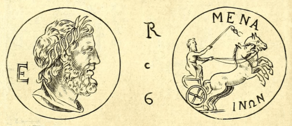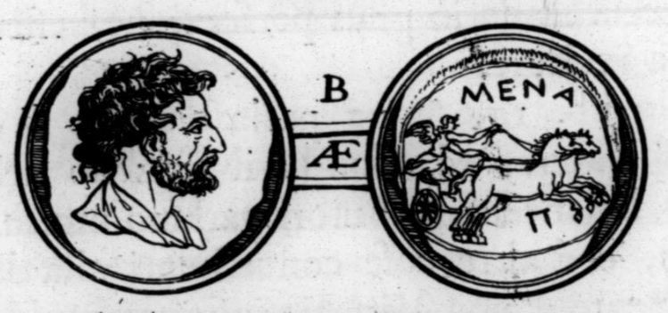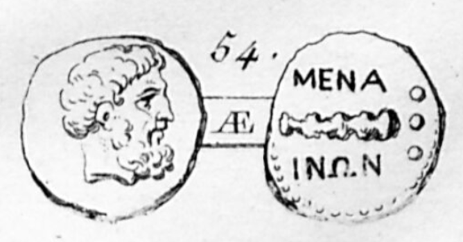 MENE – Dallo stesso Mons. Pellerin [Recueil de Medailles de Peuples et de Villes et c.] Tav. CX n. 54 fu pubblicata la Medaglia in rame di Mene qui delineata (a) [fig. 10]. Allude essa tutta al culto di Ercole, poiché sta in una parte la di lui testa con ispida, e folta barba, e nel rovescio la Clava colla Iscrizione MENAINΩN.