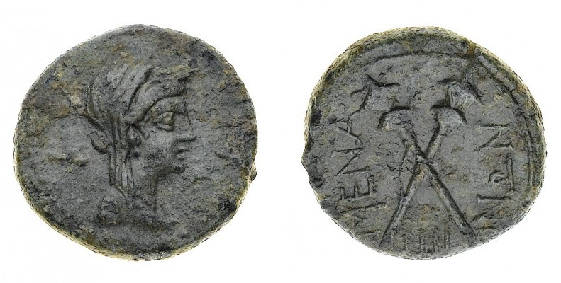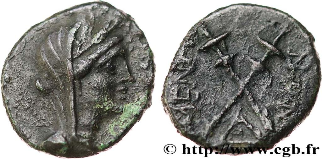 Sul mercato numismatico circolano vari esemplari, riconducibili ai modelli già catalogati dal Peruta. Si veda per esempio questa datata 212 a.C. (“Trias AE – Naville Numismatics Ltd 10, 26.10.2014, lotto 15 g. 3,38”) [fig. 14], molto simile alla fig. 1 ma con la spiga di Demetra nell’acconciatura.