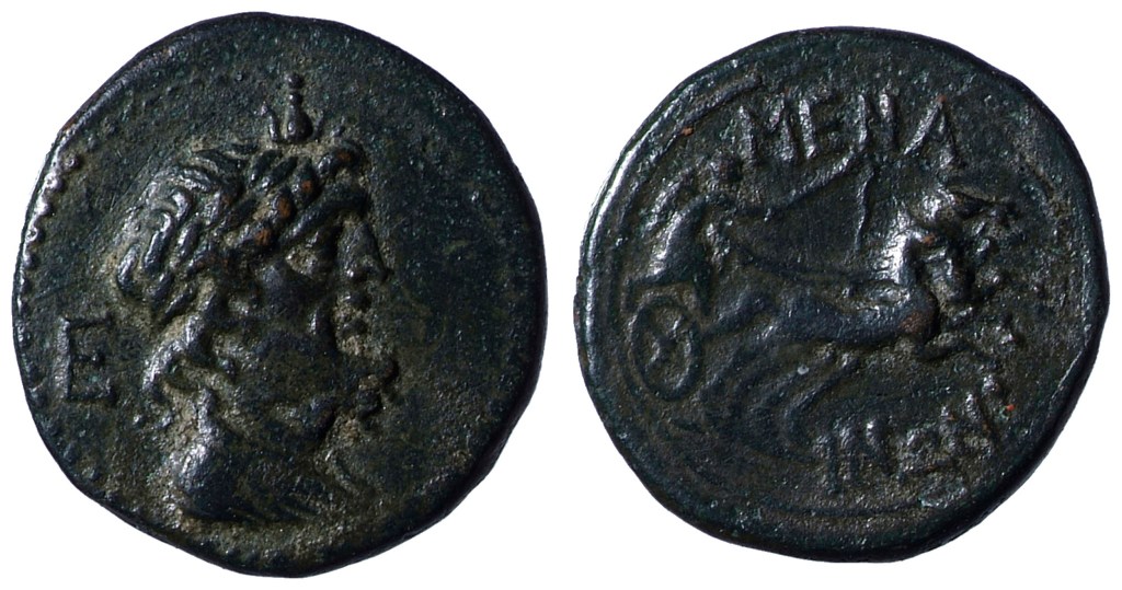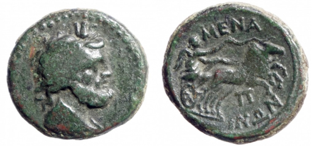 La combinazione di Zeus sul dritto e la biga sul rovescio è piuttosto significativa e suggerisce una moneta di particolare importanza nel sistema monetario locale. Zeus, come divinità suprema, conferiva legittimità e autorità, mentre la biga rappresentava prestigio e potere. Questa moneta, rispetto alle precedenti che hai mostrato, sembra riflettere temi più legati al potere politico e al prestigio civico piuttosto che ai culti agricoli o della medicina, mostrando ancora una volta la varietà tematica della monetazione di Menainon.