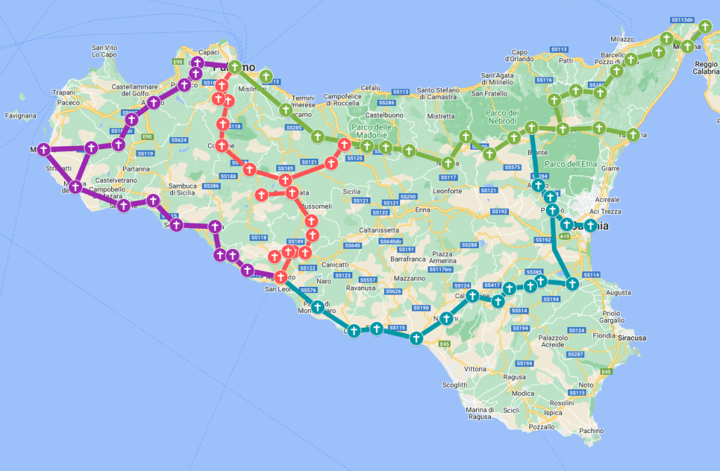 La mappa illustra il sistema dei percorsi francigeni in Sicilia, vie di pellegrinaggio che costituivano il tratto finale di un network europeo di strade che collegavano l’Europa occidentale a Roma e ai porti d’imbarco per la Terra Santa.