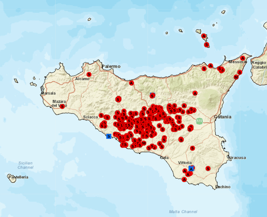 - Caltanissetta: Miniera Benuntende, Miniera Gessolungo, Miniera Giumentaro, Miniera Iungio Tumminelli, Miniera Saponara, Miniera Serradigessi, Miniera Stretto, Miniera Trabonella.
